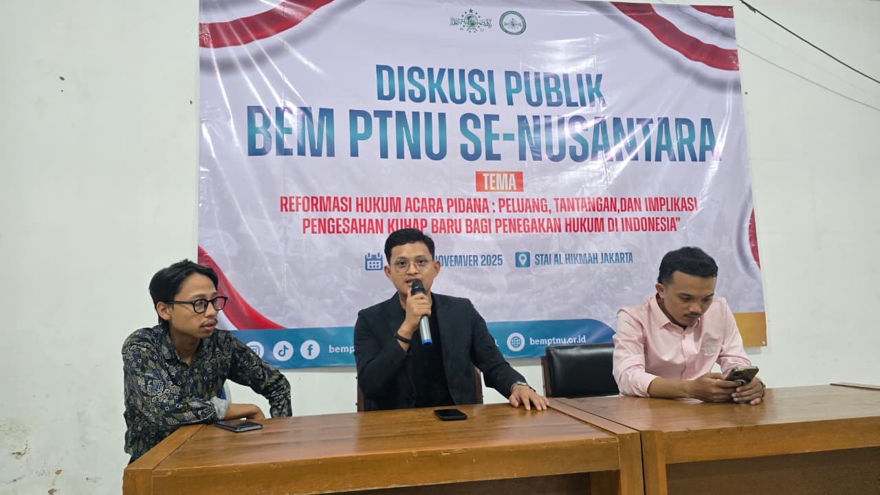 Jakarta – Badan Eksekutif Mahasiswa Perguruan Tinggi Nahdlatul Ulama (BEM PTNU) se-Nusantara menggelar diskusi publik bertajuk “Reformasi Hukum Acara Pidana: Peluang, Tantangan, dan Implikasi Pengesahan KUHAP Baru bagi Penegakan Hukum di Indonesia” pada Jumat, 21 November 2025 di STAI Al Hikmah Jakarta.