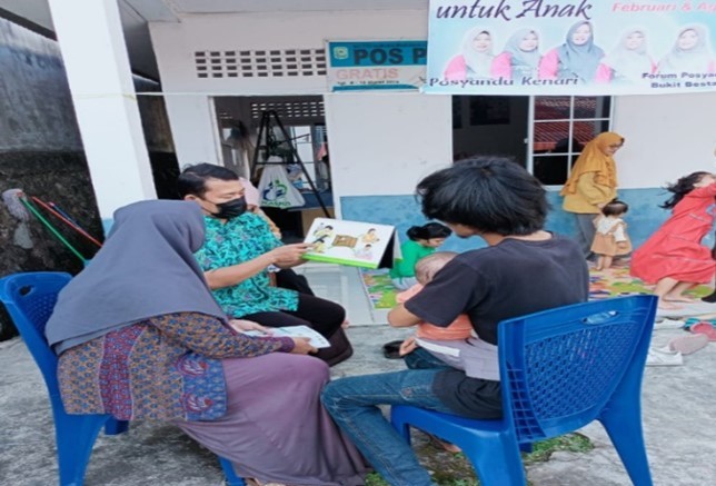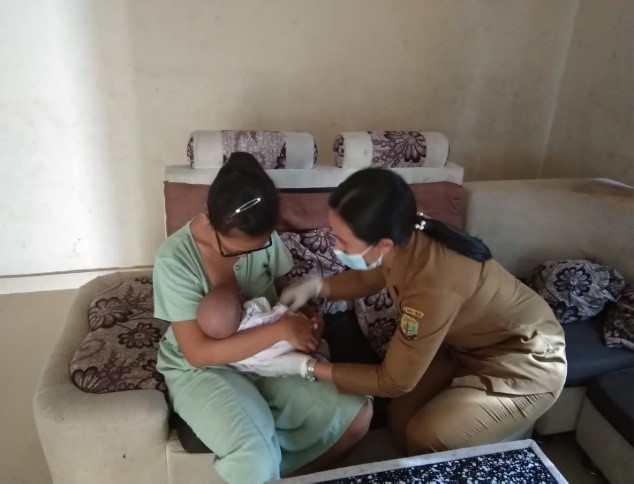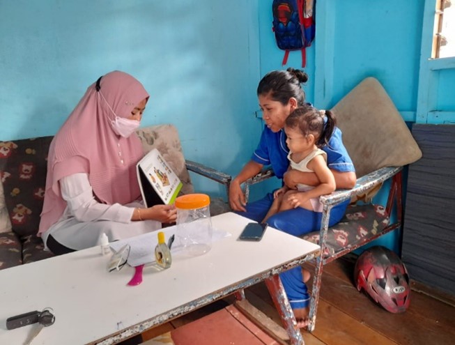 Tenaga Kesehatan sedang melakukan edukasi kepada keluarga terkait pencegahan stunting termasuk Inisiasi Menyusu Dini (IMD), ASI Eksklusif 6 bulan, memberikan makanan pendamping ASI sejak usia6 bulan (MP-ASI) dan yang terakhir melanjutkan pemberian ASI sampai dengan usia 2 tahun. (Foto: Ist)