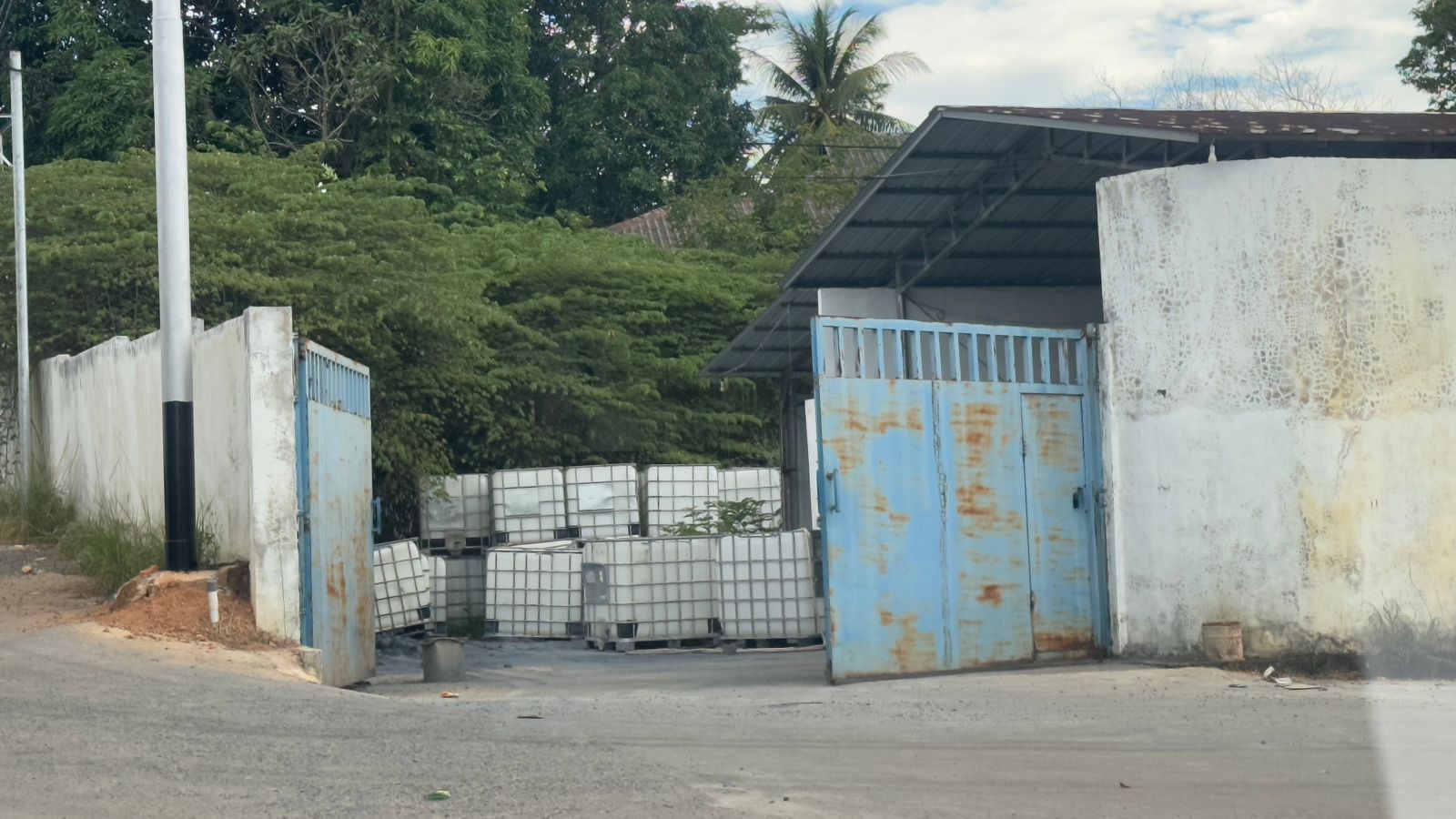 Pantauan lapangan menunjukkan area pabrik tertutup pagar tinggi tanpa papan nama. Di dalamnya, tampak sejumlah drum berisi cairan kimia tanpa label jelas.