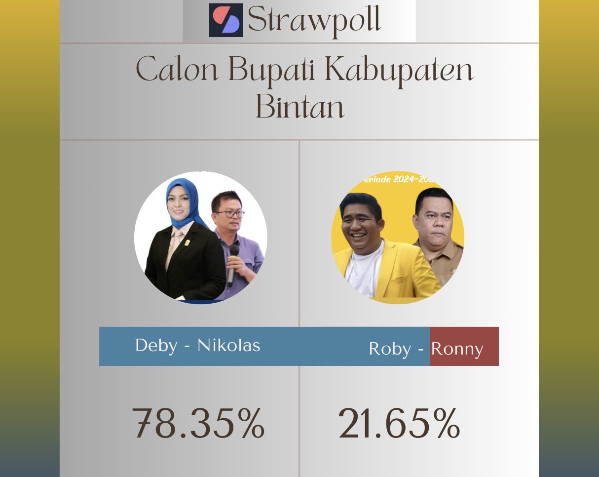 Strawpoll menunjukkan hasil survei terbaru peta elektoral jelang Pilkada serentak 2024 di Kabupaten Bintan Provinsi Kepri. Hasil survei menunjukkan elektabilitas Deby Maryanti-Nikolas Panama sebesar 78,35 persen.