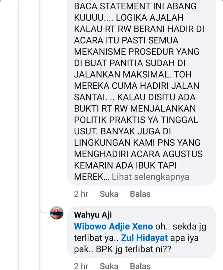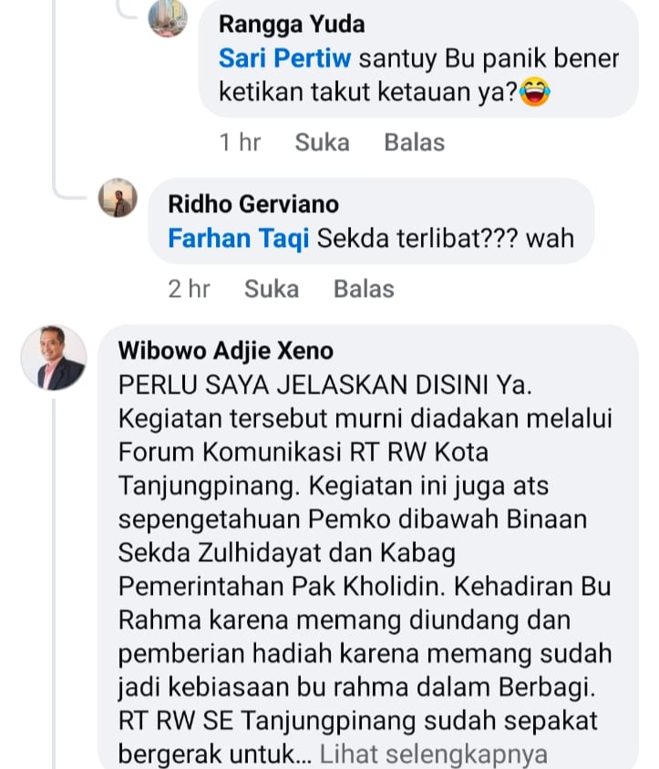 Melihat penjelasan itu, akun atas nama Wahyu Aji menjawab tulisan Wibowo Adjie Xeno dan menanyakan apakah Sekda Tanjungpinang terlibat acara itu yang diduga berpihak ke Rahma.