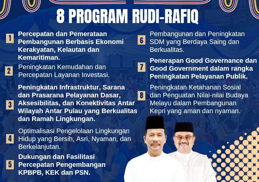 “Cukup kita sampaikan ke saudara-saudara kita di seluruh Kepri, khususnya sampaikan saja visi misi dan delapan program unggulan kita,” kata Rudi.