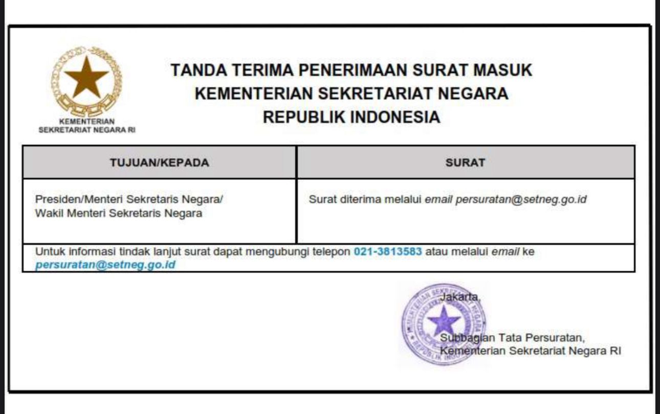 Laporan tersebut telah diterima secara administratif oleh Setneg, dibuktikan dengan tanda terima surat masuk yang ditujukan kepada Presiden, Menteri Sekretaris Negara, dan Wakil Menteri Sekretaris Negara.