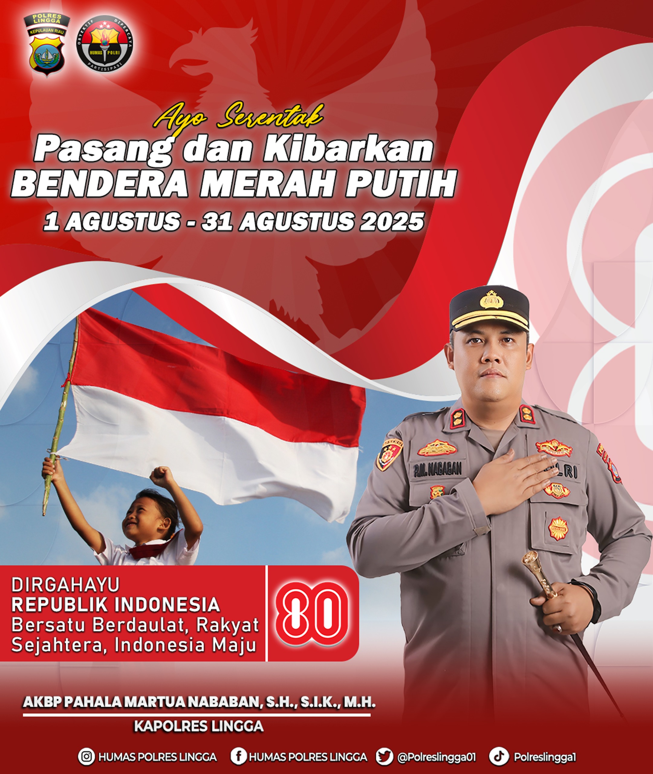Ulasfakta.co- Menyambut Hari Ulang Tahun ke-80 Kemerdekaan Republik Indonesia, Kepolisian Resor Lingga mengimbau seluruh masyarakat untuk mengibarkan bendera Merah Putih secara serentak selama bulan Agustus, mulai tanggal 1 hingga 31 Agustus 2025 di Kabupaten Lingga. Kamis (31/7/2025)
