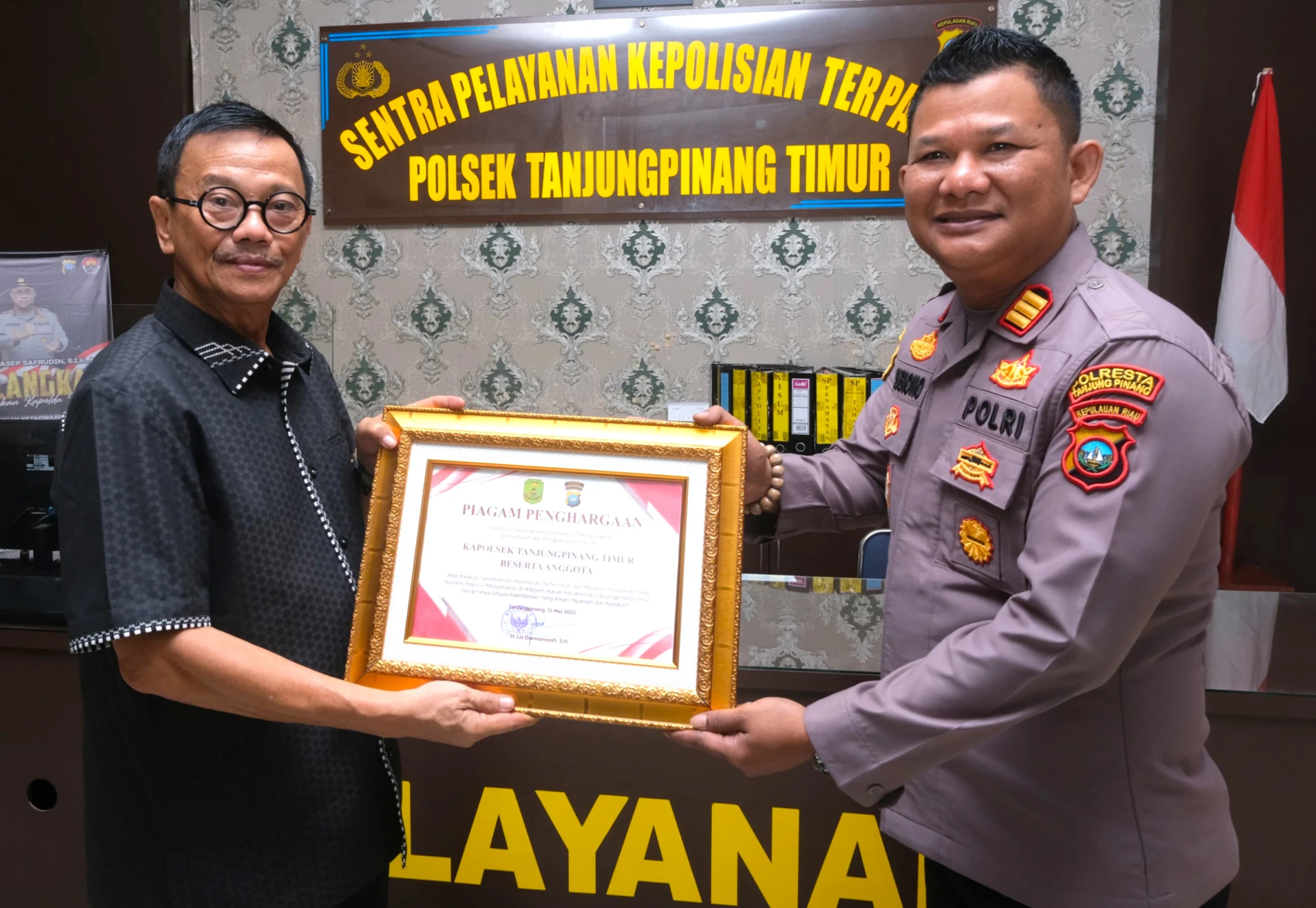 Ulasfakta — Kapolsek Tanjungpinang Timur AKP Sugiono diganjar dua piagam penghargaan—masing‑masing dari Pemerintah Kota dan DPRD Tanjungpinang—atas dedikasinya menjaga keamanan dan ketertiban di wilayah tersebut.