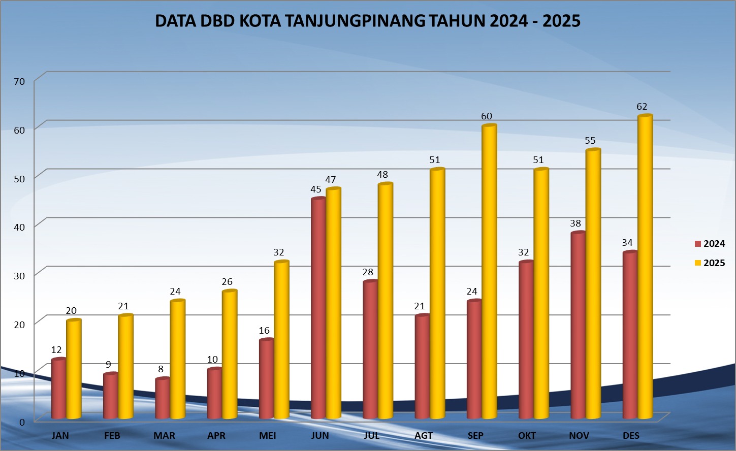 Berdasarkan data Dinas Kesehatan, jumlah kasus DBD di Kota Tanjungpinang pada 2025 mengalami peningkatan dibandingkan 2024, dengan lonjakan cukup tinggi terjadi di sejumlah kelurahan, seperti Batu 9, Pinang Kencana, Melayu Kota Piring, Tanjung Ayun Sakti, dan Sei Jang. Peningkatan juga terlihat pada paruh kedua tahun, terutama menjelang akhir tahun.