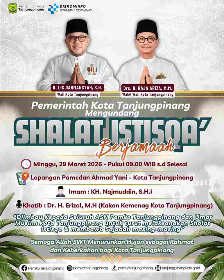 Tanjungpinang — Kemarau panjang yang mulai berdampak pada ketersediaan air bersih mendorong Pemerintah Kota Tanjungpinang mengajak masyarakat menggelar Salat Istisqa’ sebagai upaya memohon turunnya hujan.