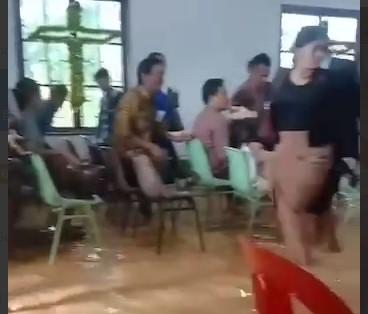 Rekaman yang diunggah akun Wajah Batam menampilkan jemaat—termasuk balita—tetap melanjutkan kebaktian meski air setinggi mata kaki menggenangi ruang utama. Seorang ibu terlihat menggendong anaknya sambil berdiri di antara deretan kursi yang terendam.