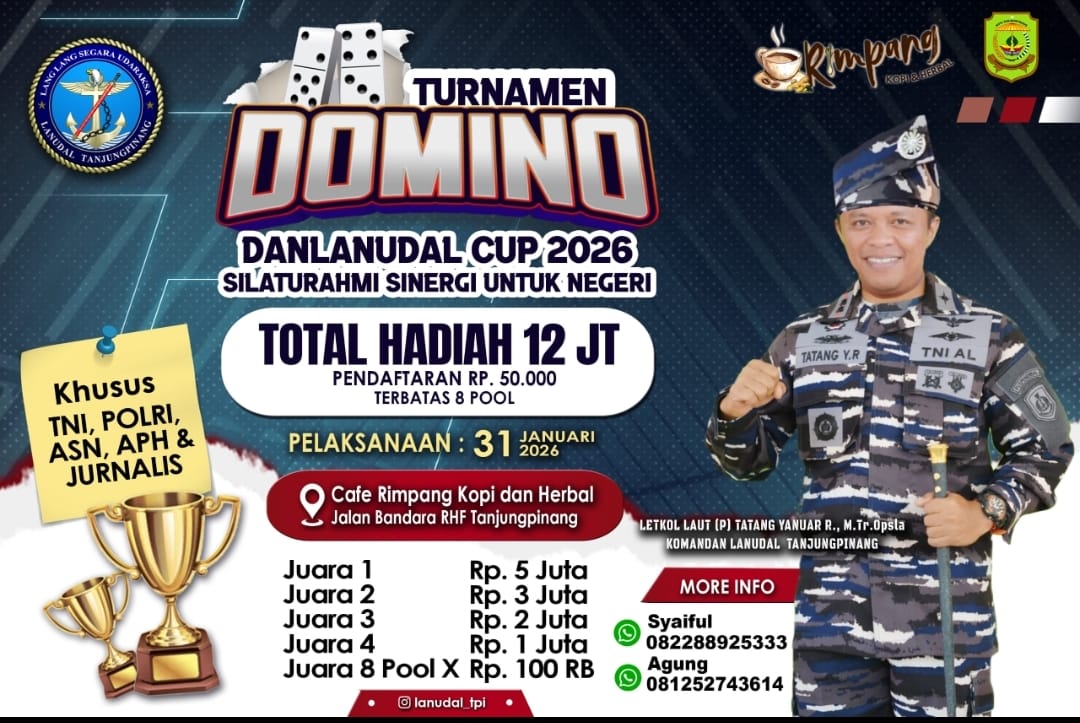 Tanjungpinang – Pangkalan Udara Angkatan Laut (Lanudal) Tanjungpinang akan menggelar turnamen domino bertajuk Danlanudal Cup 2026 pada Sabtu malam, 31 Januari 2026. Kegiatan bertema Silaturahmi Sinergi untuk Negeri ini berlangsung di Cafe Rimpang Kopi dan Herbal, Jalan Bandara RHF, Tanjungpinang.