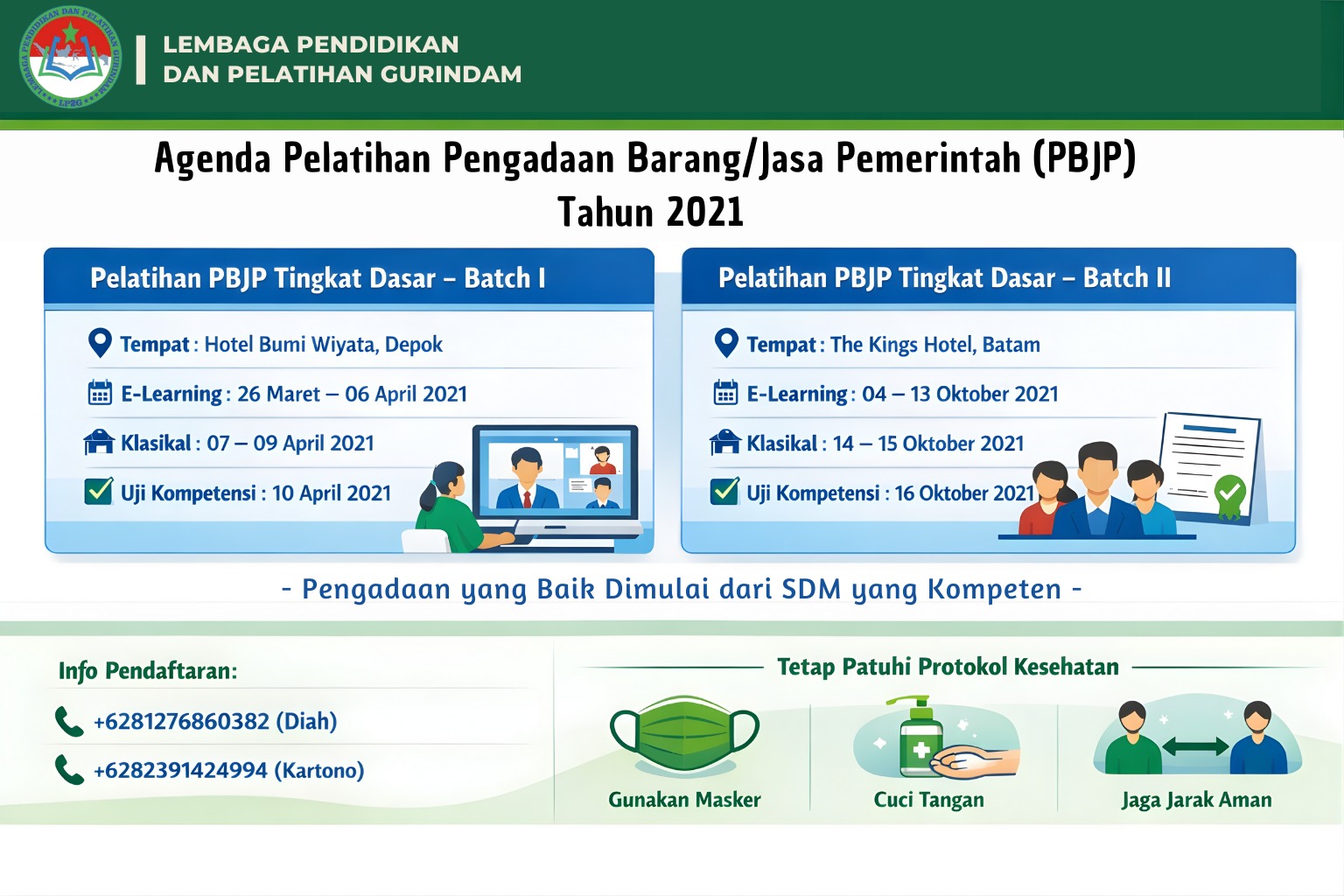 Sementara itu, Pelatihan PBJP Tingkat Dasar Batch II dilaksanakan di The Kings Hotel, Batam. Tahapan e-learning berlangsung pada 4–13 Oktober 2021, dilanjutkan kegiatan klasikal pada 14–15 Oktober 2021, dan uji kompetensi pada 16 Oktober 2021. Pelaksanaan pelatihan tetap memperhatikan penerapan protokol kesehatan secara ketat selama kegiatan berlangsung.