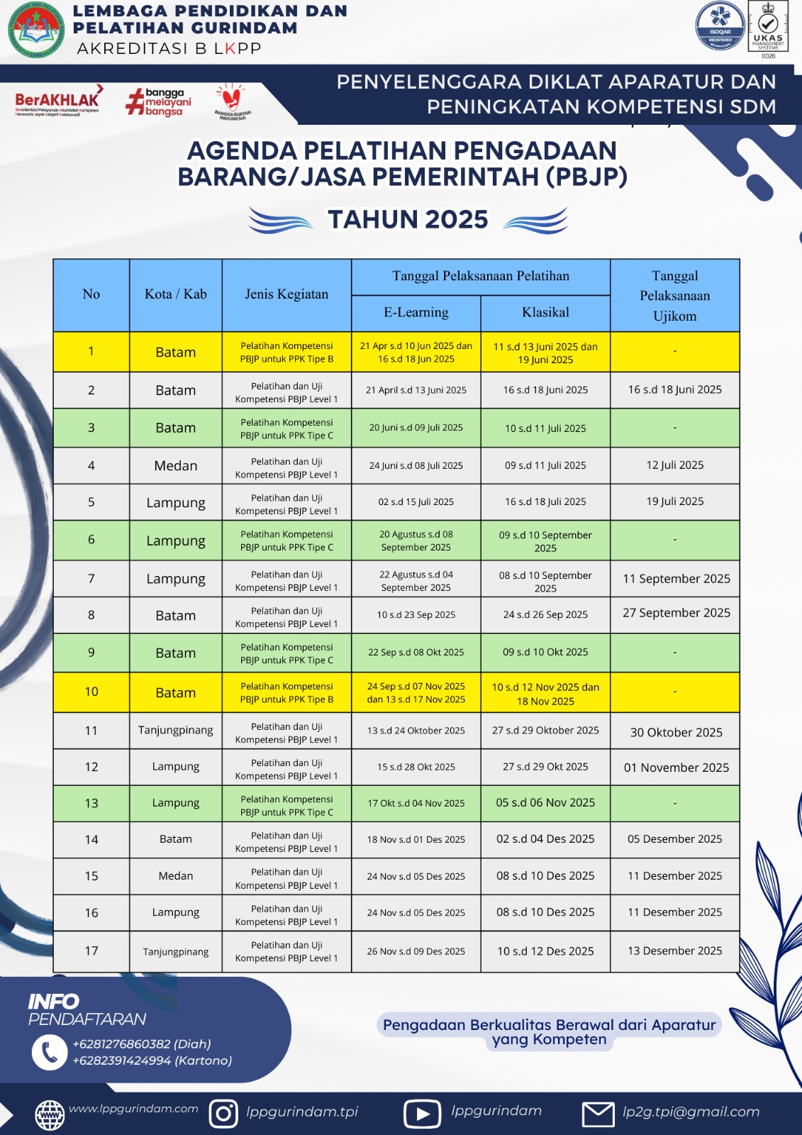 Tanjungpinang – Lembaga Pendidikan dan Pelatihan (LPP) Gurindam resmi merilis Agenda Pelatihan Pengadaan Barang/Jasa Pemerintah (PBJP) Tahun 2025. Program ini ditujukan untuk meningkatkan kompetensi aparatur pemerintah dalam pengelolaan pengadaan barang dan jasa secara profesional dan akuntabel.