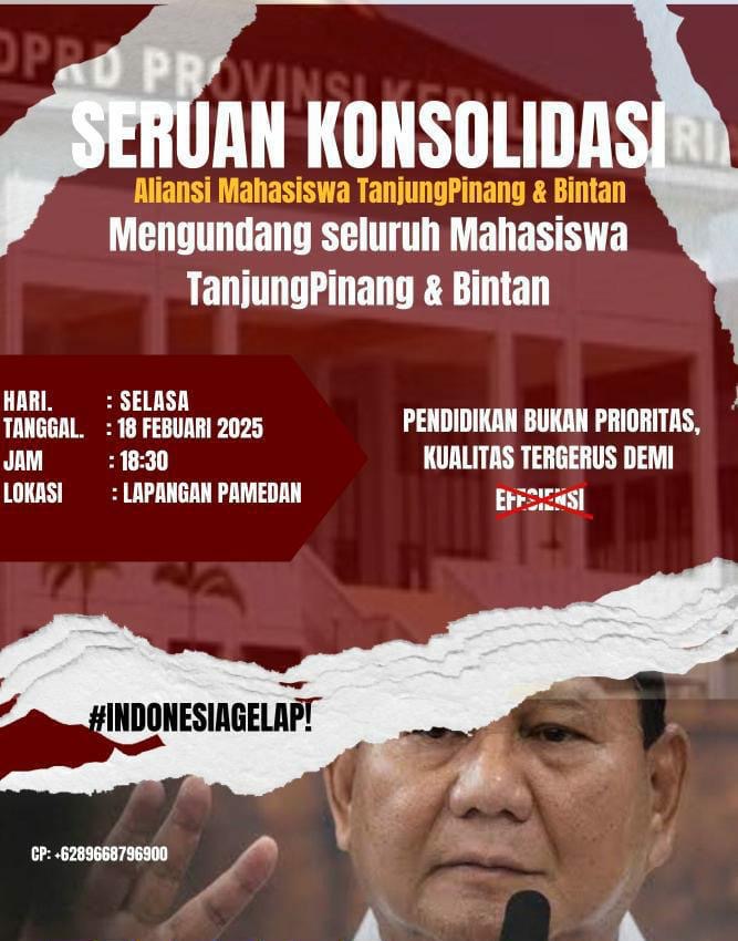 Ulasfakta – Aliansi Mahasiswa Tanjungpinang & Bintan menggelar seruan konsolidasi yang mengundang seluruh mahasiswa di wilayah tersebut. Acara ini dijadwalkan berlangsung pada Selasa, 18 Februari 2025, pukul 18.30 WIB di Lapangan Pamedan, Tanjungpinang.