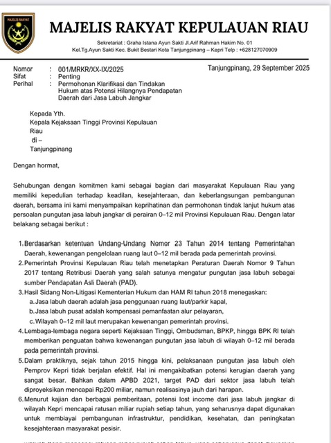 ULASFAKTA-Tanjungpinang – Majelis Rakyat Kepulauan Riau (MRKR) melayangkan surat resmi kepada Kejaksaan Tinggi Provinsi Kepulauan Riau pada Senin (29/9/2025) terkait persoalan pungutan jasa labuh jangkar di wilayah laut 0–12 mil. Surat bernomor 001/MRKR/XX-IX/2025 tersebut berisi permohonan klarifikasi dan tindakan hukum atas potensi hilangnya pendapatan daerah yang nilainya ditaksir mencapai ratusan miliar rupiah setiap tahun.