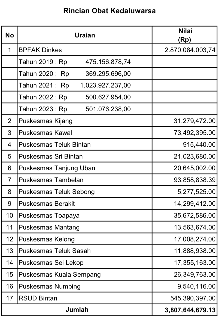 Adapun obat-obatan yang telah kedaluwarsa berada pada Balai Unit Pelaksana Teknis Daerah (UPTD) Pengelolaan Farmasi dan Alat Kesehatan (BPFAK) Dinkes adalah sebesar Rp2.870.084.003,74, puskesmas sebesar Rp392.170.278,39 dan BLUD RSUD Bintan sebesar Rp545.390.397,00.