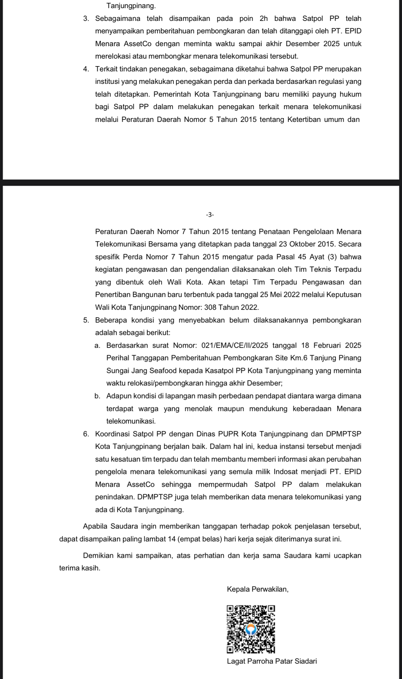 Dalam poin 3 laporan tersebut ditegaskan, sebagaimana dijelaskan pada poin 2 huruf h, Satpol PP Kota Tanjungpinang telah menyampaikan surat pemberitahuan pembongkaran kepada PT EPID Menara AssetCo. Namun, perusahaan justru meminta tenggat waktu hingga akhir Desember 2025 untuk melakukan relokasi atau pembongkaran menara.