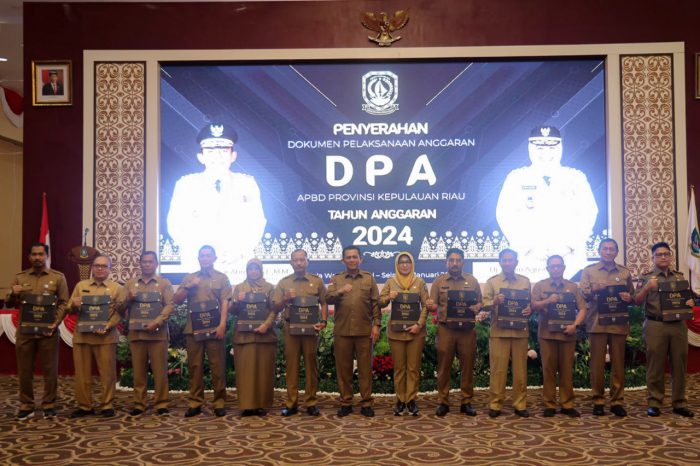 Ulasfakta.co – Gubernur Kepulauan Riau Ansar Ahmad, menyerahkan Dokumen Pelaksanaan Anggaran SKPD (DPA-SKPD) untuk APBD Tahun 2024. Selain menyerahkan DPA SKPD, pada kesempatan itu Ansar Ahmad juga melaksanakan penandatanganan perjanjian kinerja Kepala OPD di lingkungan Pemprov Kepri di Aula Wan Seri Beni,Pulau Dompak, Tanjungpinang Selasa (02/1/2024).