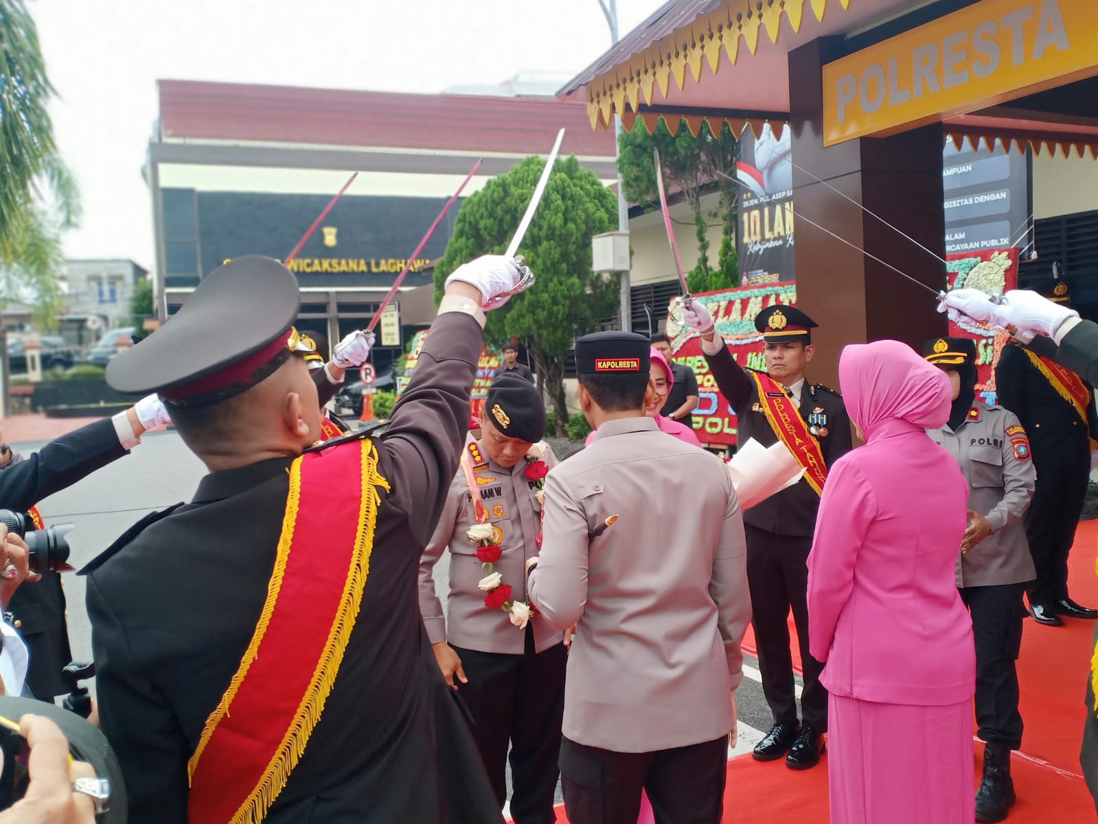 Sejumlah tradisi kedinasan mewarnai prosesi penyambutan Kapolresta baru. Kombes Pol Indra Ranu Dikarta tiba di Mapolresta bersama istrinya, Ny. Fita Indra Ranu. Keduanya disambut dengan pengalungan bunga, pertunjukan pencak silat, jajar kehormatan, pedang pora, serta tarian sekapur sirih yang dibawakan oleh polisi wanita.