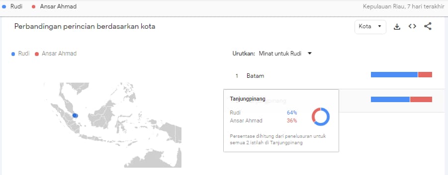 Sedangkan popularitas Rudi khususnya di Ibu Kota Kepri, Tanjungpinang, mencapai 64 persen.