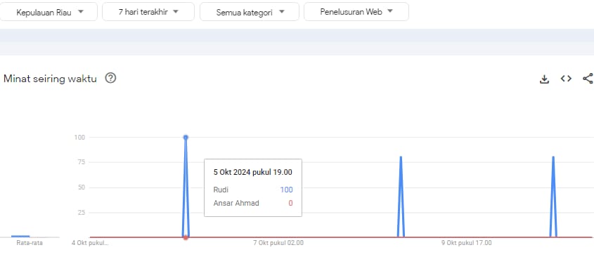 Pada waktu-waktu tertentu, popularitas Rudi bahkan di atas 77 persen. Misalnya bisa mencapai puncak 100 persen pada 5 Oktober 2024 pukul 19.00 WIB. Juga terjadi di atas 77 persen pada 8 dan 10 Oktober 2024.