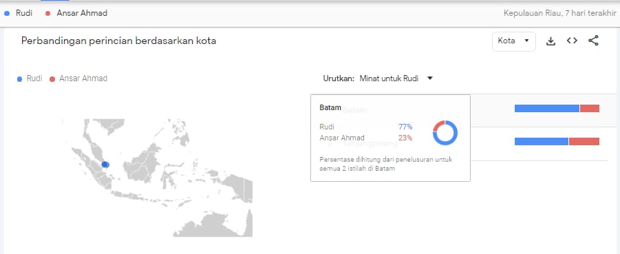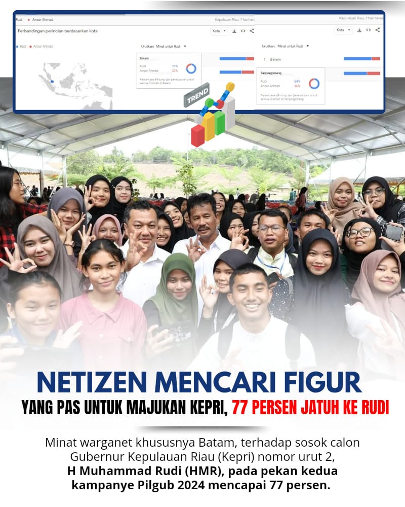 Ulasfakta.co – Minat warganet khususnya Batam terhadap sosok calon Gubernur Kepri nomor urut 2, H Muhammad Rudi (HMR) pada pekan kedua kampanye mencapai 77 persen.