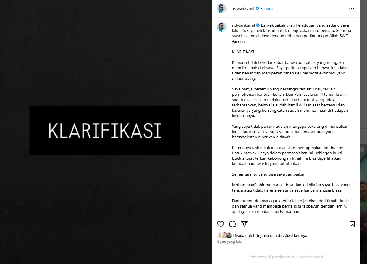 RK juga mohon doanya agar selalu dijauhkan dari fitnah dunia, dan semua yang membaca berita bisa tabbayun dengan jernih. “Apalagi ini saat bulan suci Ramadhan,” tutup RK dalam keterangan kalrifikasi di akun Instagram miliknya.