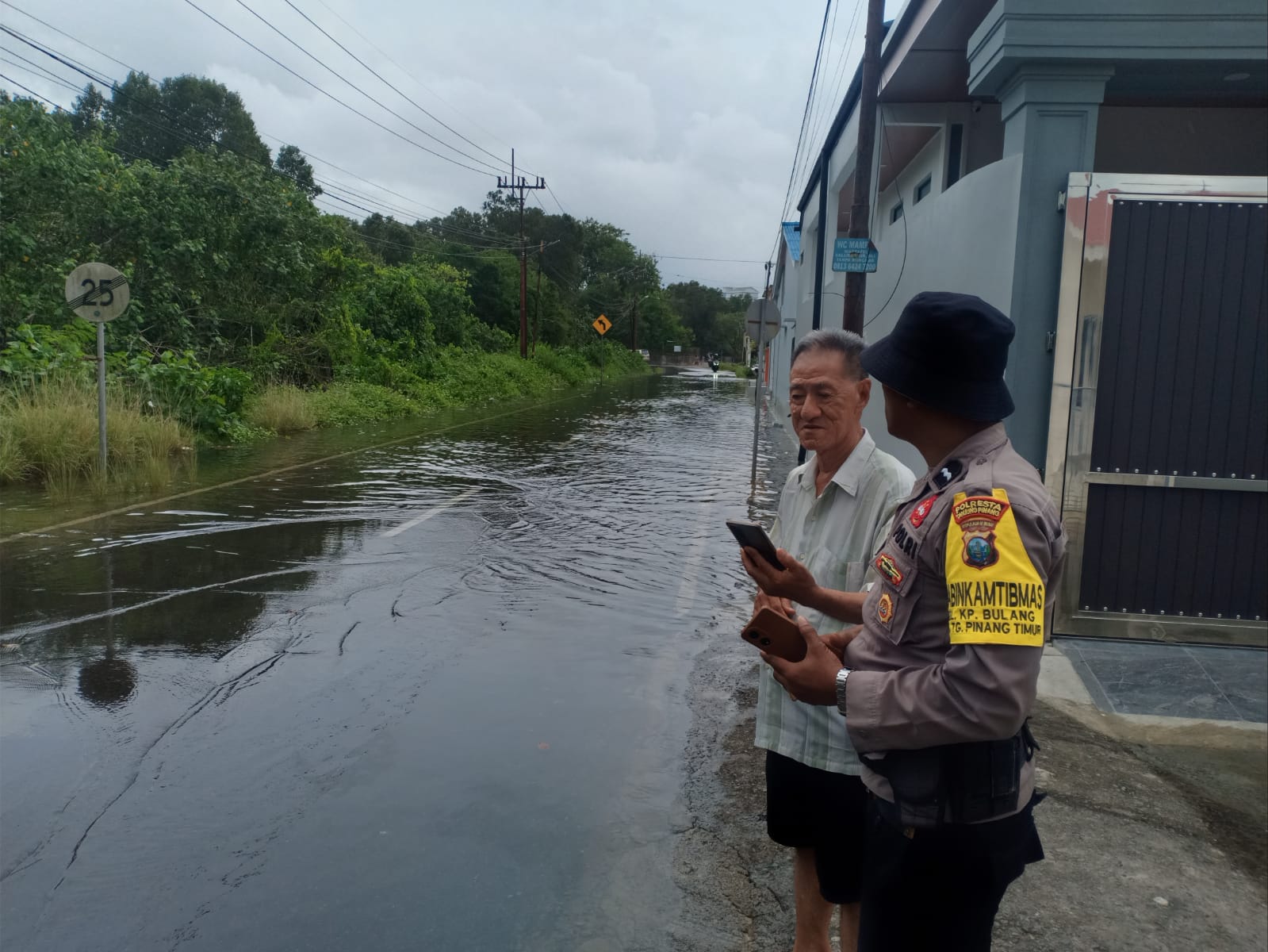 Bhabinkamtibmas Kelurahan Kampung Bulang, Aipda Chandra YS, berjaga di lokasi untuk mengamankan aktivitas masyarakat. Petugas mengarahkan pengguna jalan agar menggunakan jalur alternatif yang tidak tergenang.