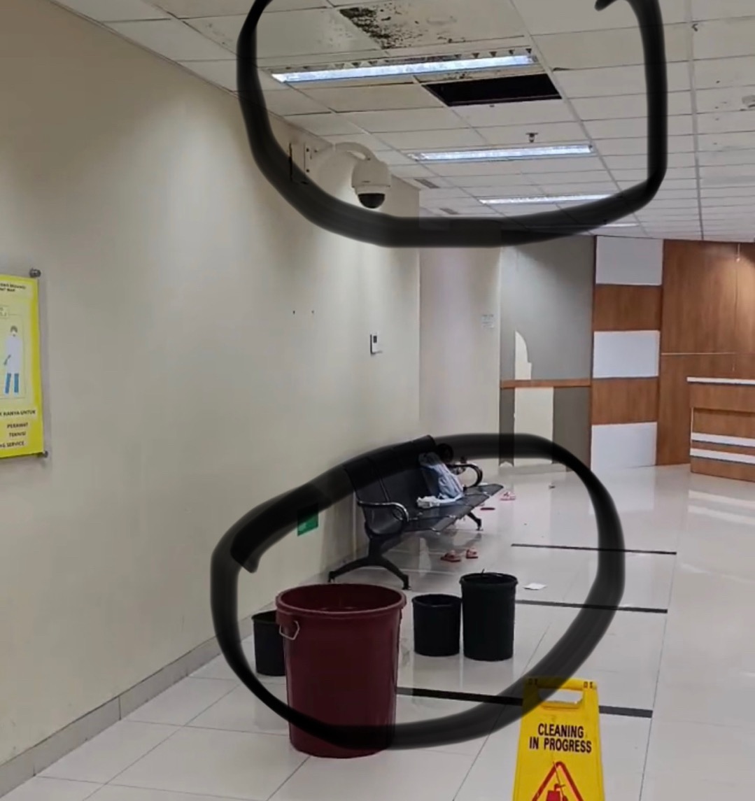 Plafon bocor di beberapa ruang tunggu dan lorong rawat inap terlihat jelas. Air menetes dari atas, sementara noda-noda cokelat akibat lembab menghiasi langit-langit bangunan.