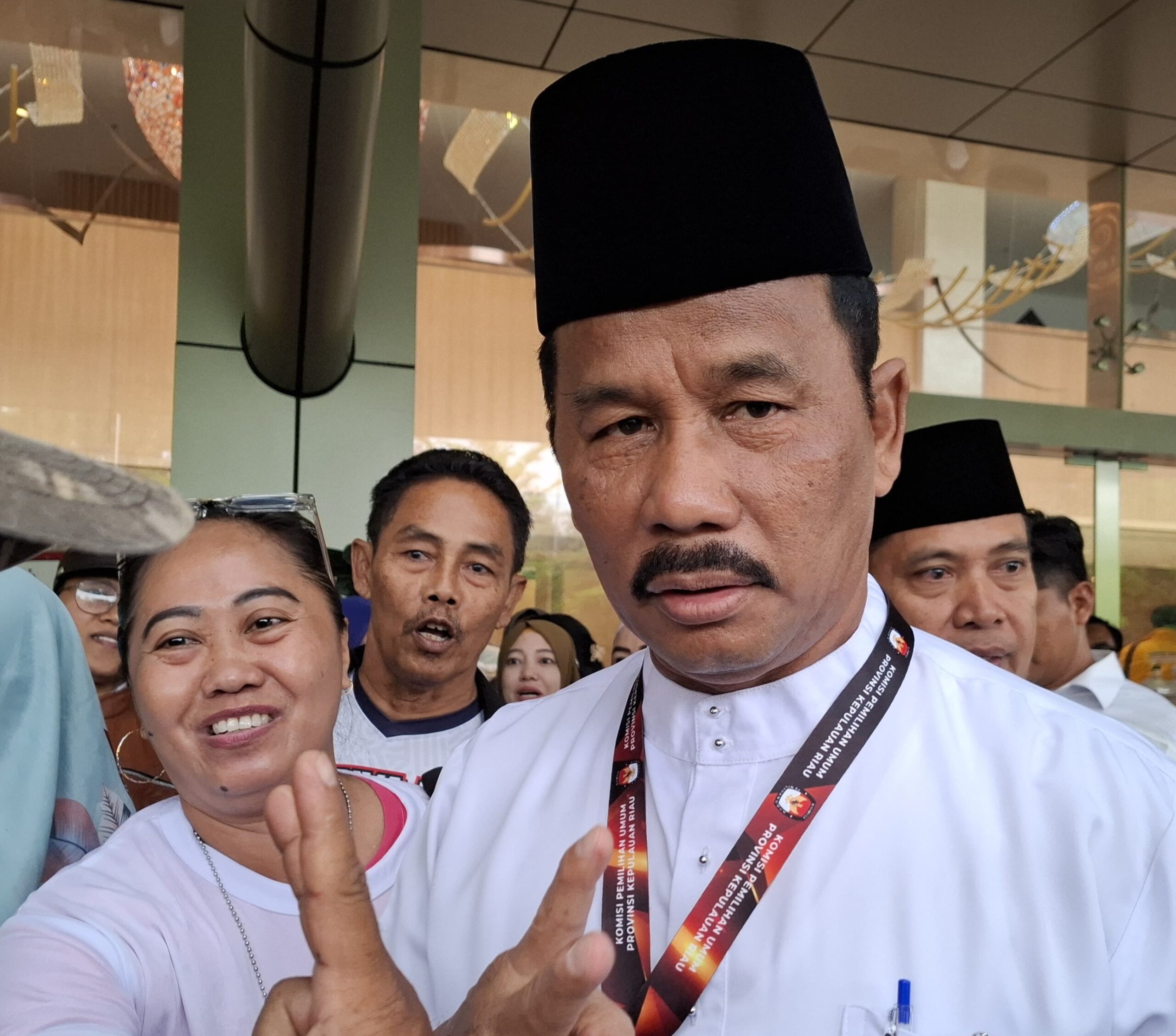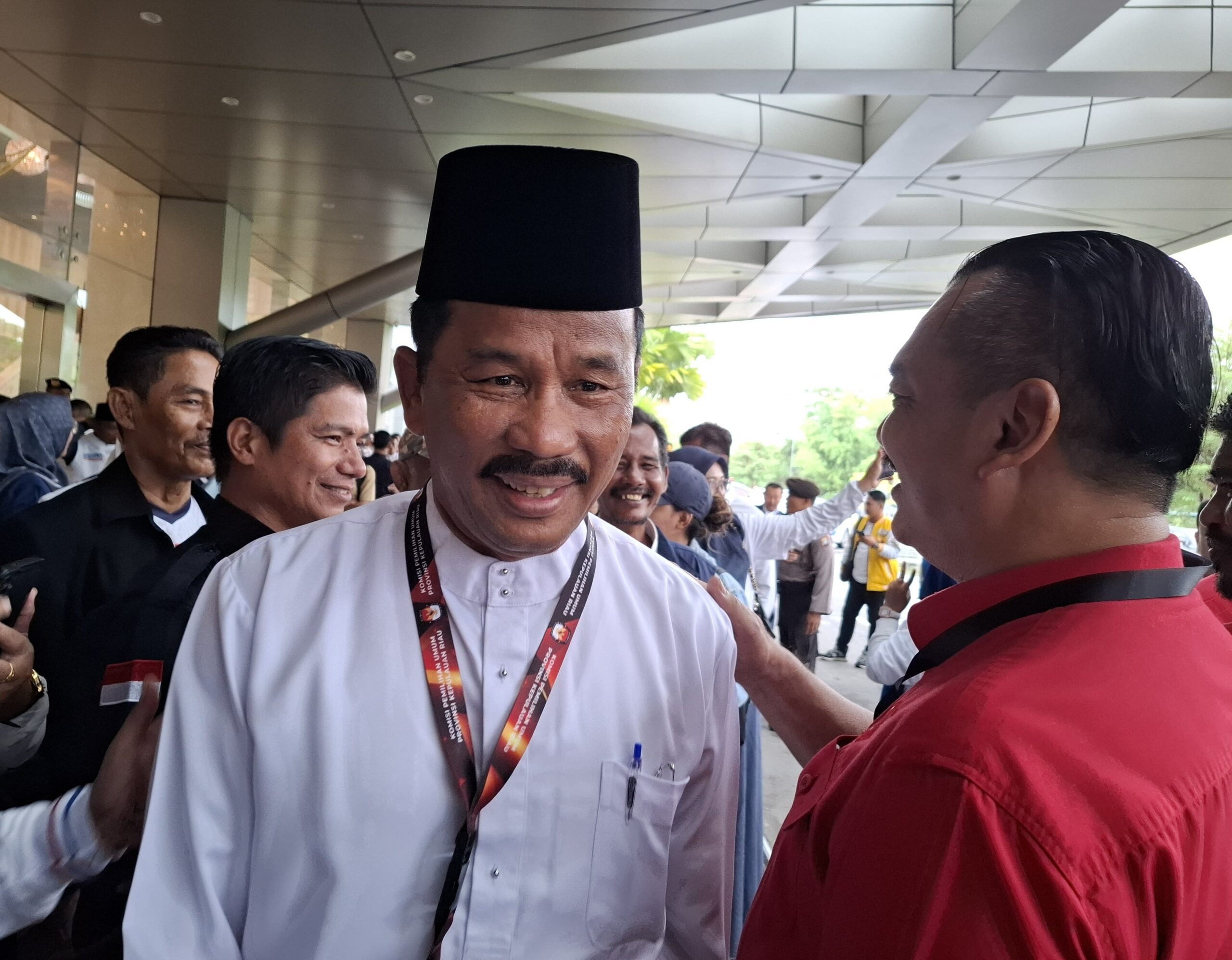 Rudi yang didampingi Ketua DPD PDIP Provinsi Kepri, Soerya Respationo, menyapa para pendukungnya di lobi hotel.