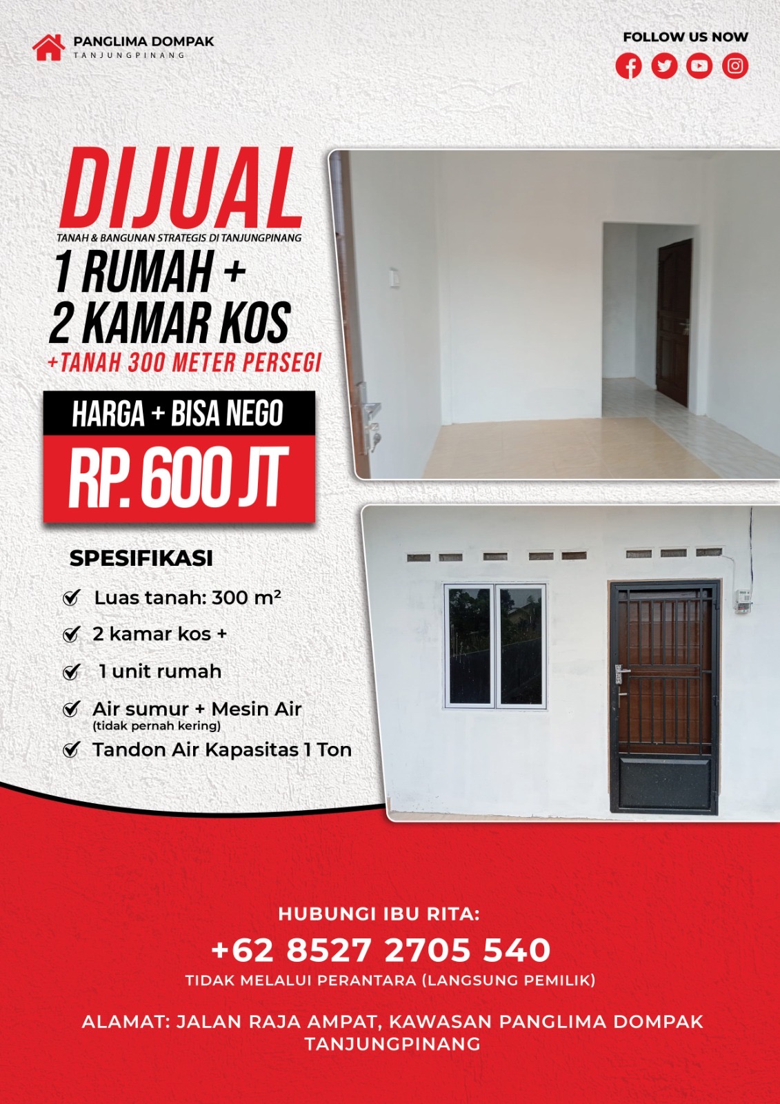 Tanjungpinang – Sebuah properti berupa 1 unit rumah lengkap dengan 2 kamar kos yang berlokasi di kawasan Panglima Dompak, Tanjungpinang, ditawarkan kepada publik dengan harga Rp600 juta dan masih bisa dinegosiasikan.