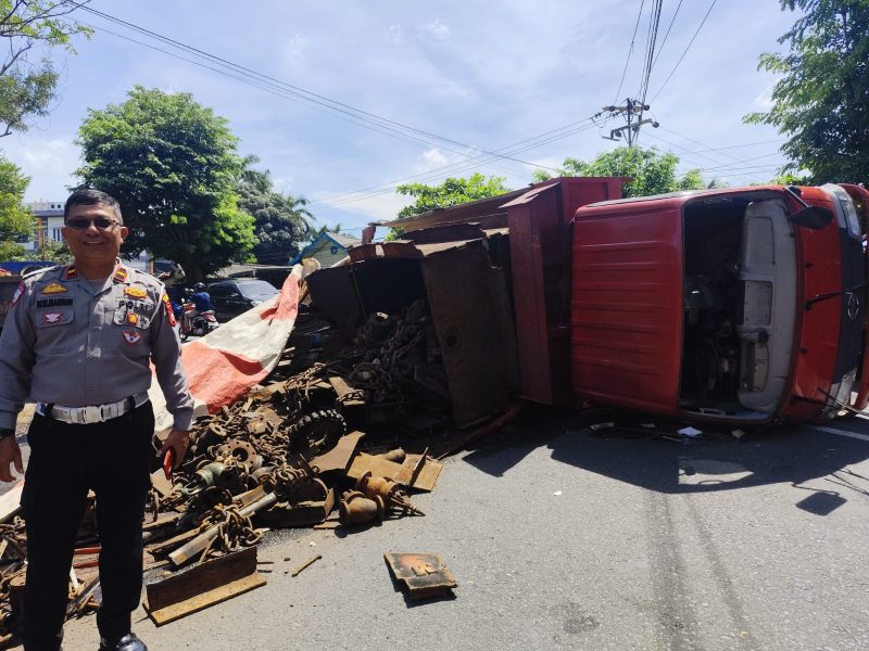 “Hasil pengecekan awal menunjukkan truk mengangkut besi tua dalam jumlah berlebih. Ketika melewati tikungan, kendaraan kehilangan keseimbangan hingga akhirnya terguling,” jelas Maldine.