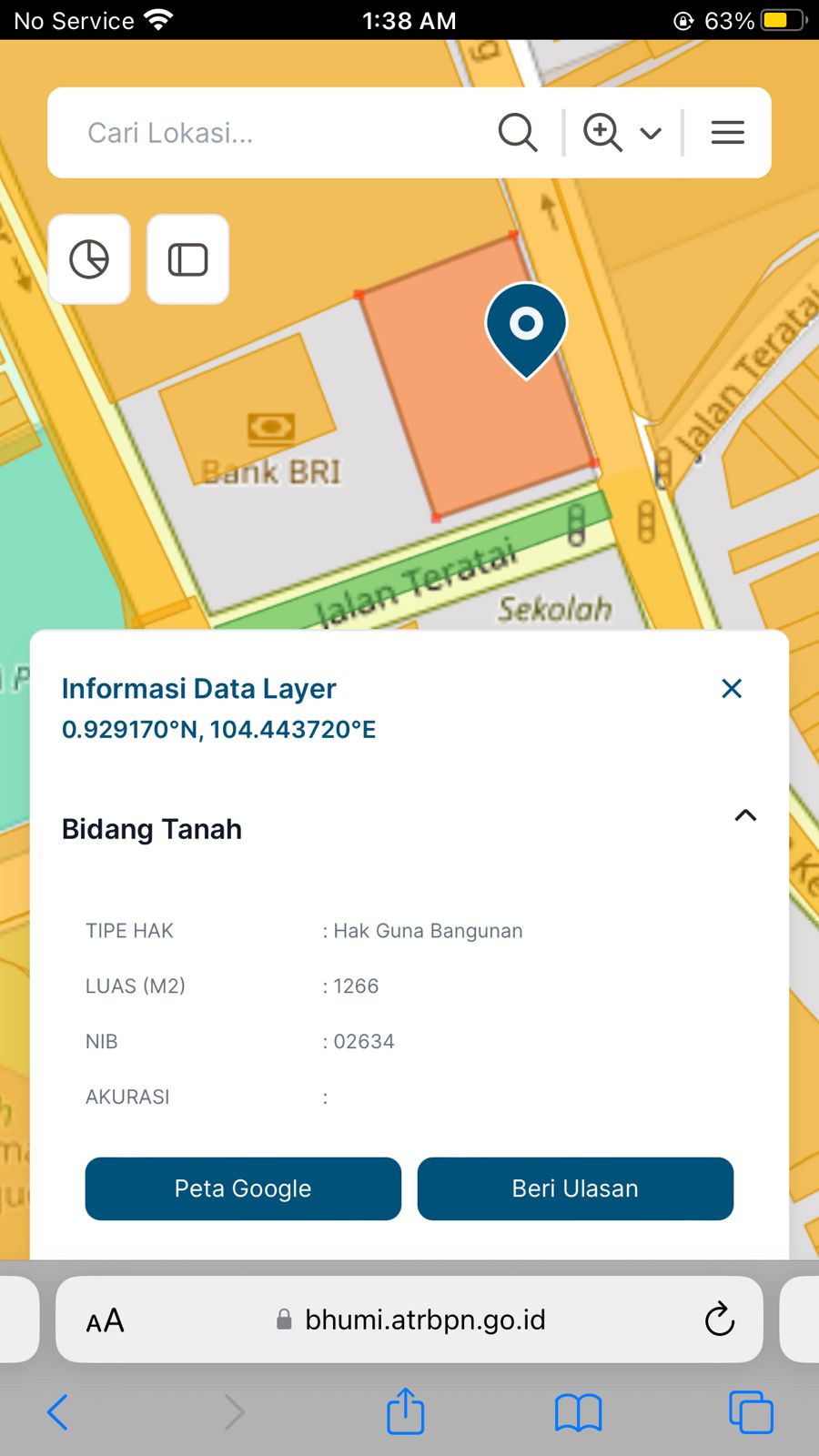Berdasarkan peta bidang tanah (bhumi.atrbpn.go.id) tertulis tipe hak adalah Hak Guna Bangunan dengan luas 1266 M2, NIB 02634.